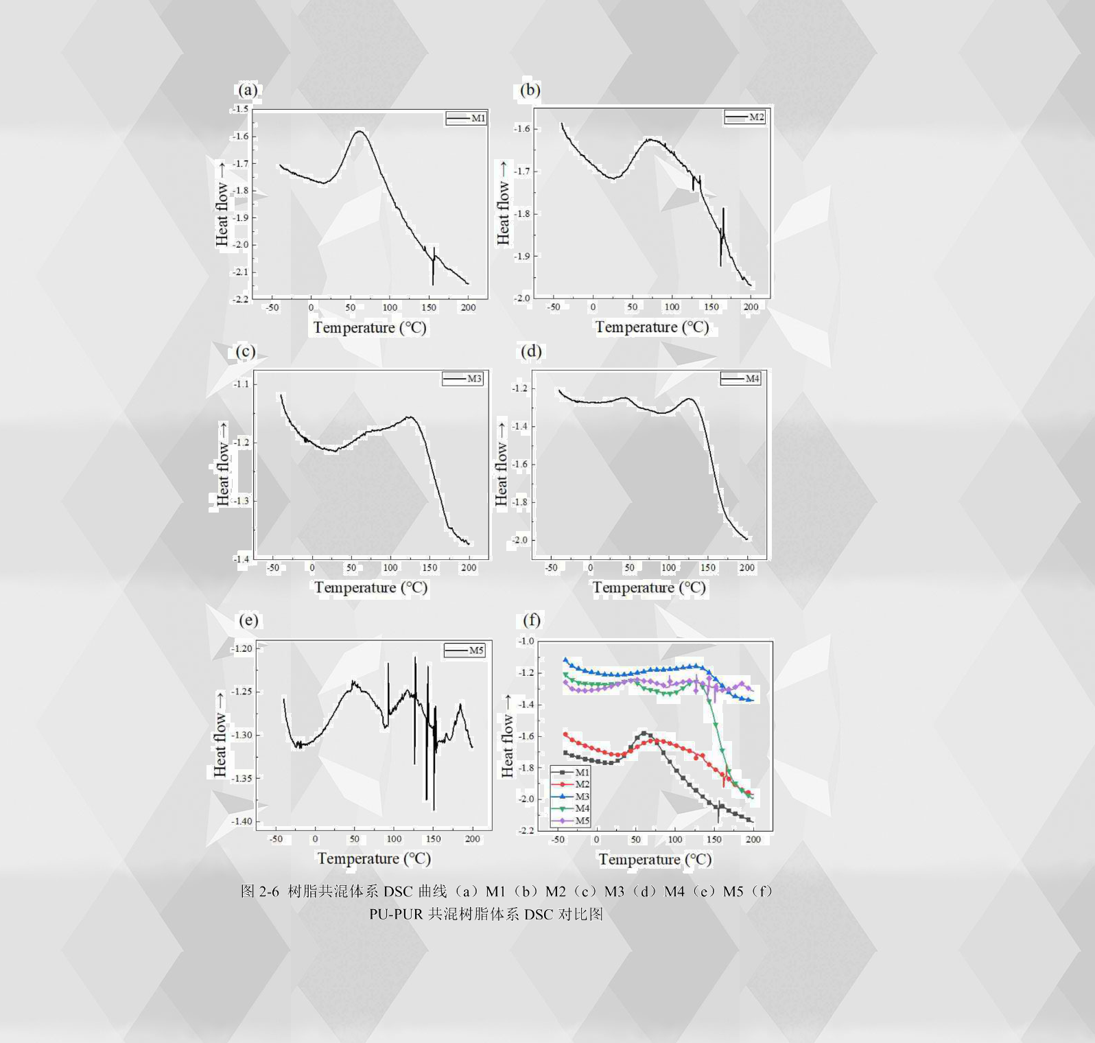 從PU-PUR共混樹脂的DSC曲線對其固化行為進行分析。從M1樹脂的DSC曲線2-6(a)上看到,曲線在35.41-86.16℃之間出現了一個明顯的放熱峰,這就是M1樹脂的固化反應峰,其峰值為59 .66℃。從M2樹脂的DSC曲線2 - 6(b)上看到,曲線在45.16-120.16℃之間出現了一個明顯的放熱峰,這就是M2樹脂的固化反應峰,其峰值為73.66℃。從M3樹脂的DSC曲線2-6(c)上看到,曲線在94.58-138.25℃出現了一個明顯的放熱峰,這就是M3樹脂的固化放熱峰,其峰值為125.08℃。從M4樹脂的DSC曲線2-6(d)上看到,曲線在98.58-140.83℃出現了一個明顯的放熱峰,這就是M4樹脂的固化放熱峰,其峰值為126.16℃。從M5樹脂的DSC曲線2-6(e)上看到,曲線出現了兩個較大的放熱峰,其中第二個較大的放熱峰位于96.50-138.08℃之間,其峰值為116.75℃。通過不同共混樹脂的DSC曲線對比2-6(f)可以看出,聚脲的加入使得共混樹脂放熱峰朝著較高溫度移動,而通過M3、M4樹脂的曲線可以看出,當聚脲含量占到共混樹脂的50%以上時,共混樹脂的固化峰值變化不大。從共混樹脂的DSC曲線和樹脂流變測試結果分析得出,樹脂DSC曲線的峰值和樹脂流變粘度-溫度曲線轉變點的結果大致符合,因此表2-3能夠作為樹脂共混體系的最佳固化溫度和時間使用。