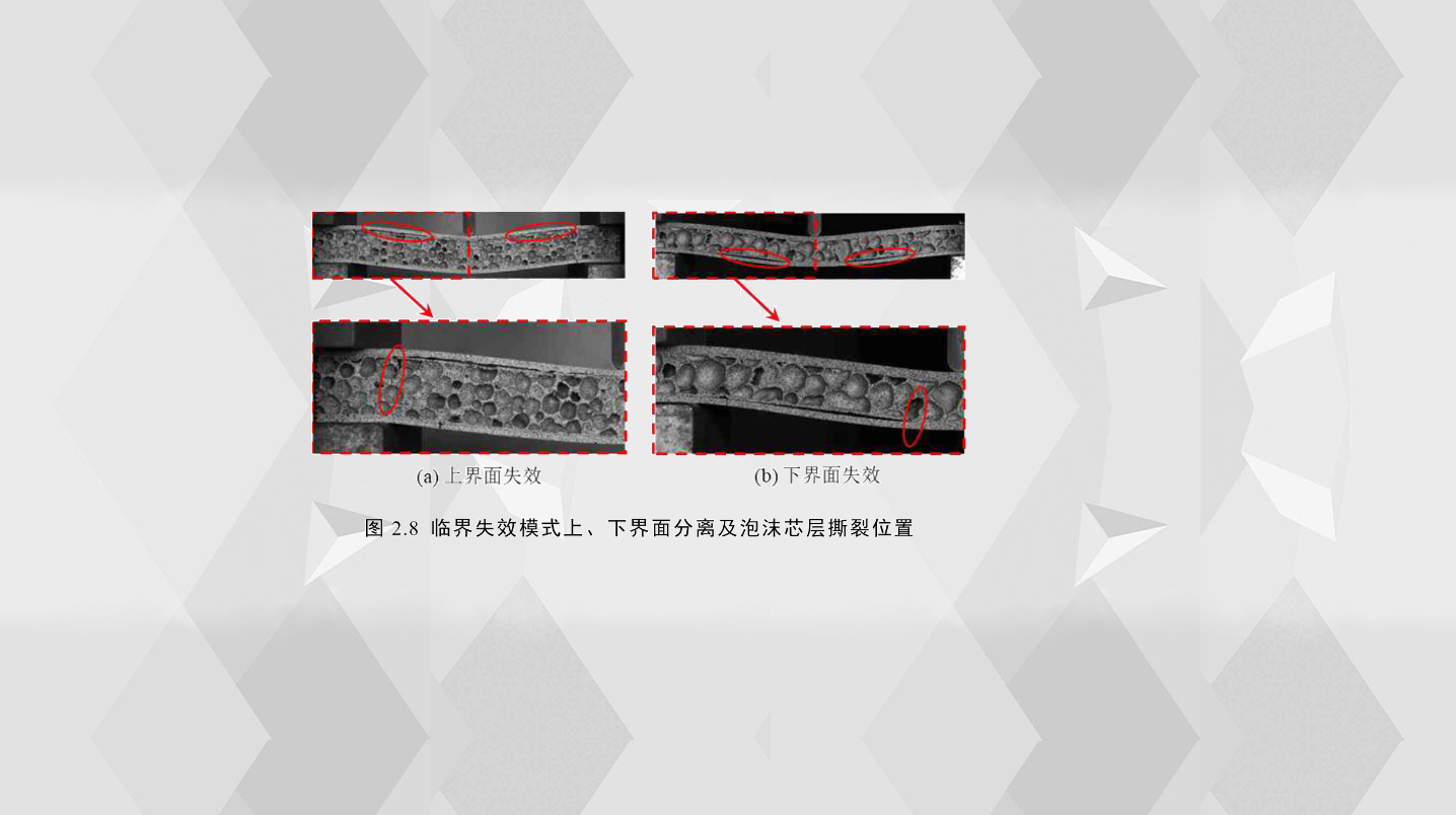 通過觀察,界面分離的主要特點是面板與膠膜分離并且膠膜緊緊地貼附在泡沫鋁上,界面分離的裂紋對稱分布在壓頭的兩側,并可能出現在上界面或下界面,如圖2.8(a)(b)所示,圖中分別展示了上下界面分離時,泡沫芯層出現撕裂的不同位置。由于CFRP和GFRP沒有鋁合金那樣明顯的塑性變形,因此纖維增強夾層結構的臨界失效模式的壓痕壓入與鋁合金夾層結構的略有不同,前者結構的面板發生彈性變形,但后者主要發生塑性變形;通過分析兩者的載-位移曲線,試件在臨界失效模式后,前者的載荷-位移曲線呈上升趨勢,而后者則相反。本章所有試件的彎曲試件的臨界失效模式總結詳見表2.3;臨界失效模式壓痕壓入(IN)主要發生在AL-F1、AL-H20和纖維增強夾層結構試樣中(除CF-F2、CF-F1.5和GF-F2);臨界失效模式芯層剪切(CS)出現在AL-F2、AL-F1.5、AL-D25、CF-F2和CF- F1.5試件中;AL-H10和AL-D65出現臨界失效模式界面分離(DB)。出乎意料的是,在GF-F2中觀察到幾乎同時存在兩種臨界破壞模式,即芯層剪切(CS)和壓痕壓入(IN)。因此,面板厚度、芯層高度對夾層結構的臨界失效模式有很大影響,隨著夾層結構面板厚度增加,試樣的剛度增加,結構的承載力增強,臨界失效模式從IN變為CS;此外,不同密度的泡沫芯層胞元大小不同,并且面板與芯層之間界面結合強度有很大差異,隨著芯層密度的增加,芯層胞元變小,面板和泡沫芯層之間膠粘劑剪切強度變小,夾層結構的臨界失效模式由CS逐漸變為DB。