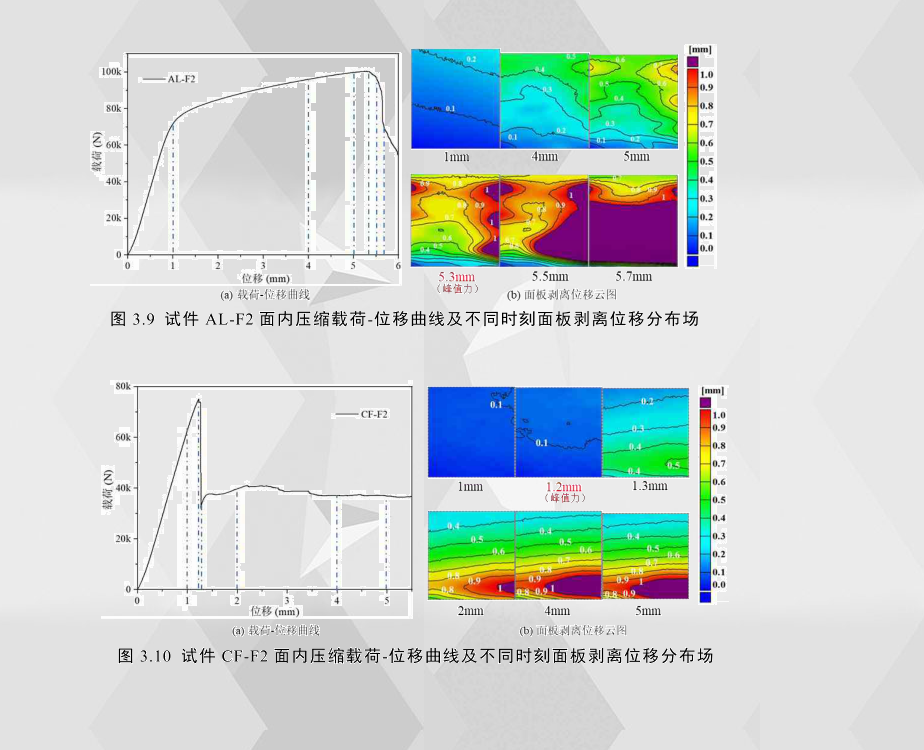 為了進一步了解泡沫鋁夾層結構面板的變形過程以及芯層與面板的分離程度,使用DIC設備測量面板的剝離位移,面板與芯層分離位移量稱為面板剝離位移分布場。圖3.9和3.10分別表示了試件AL-F2和CF-F2的載荷-位移曲線以及在不同加載位置時面板剝離位移分布場。