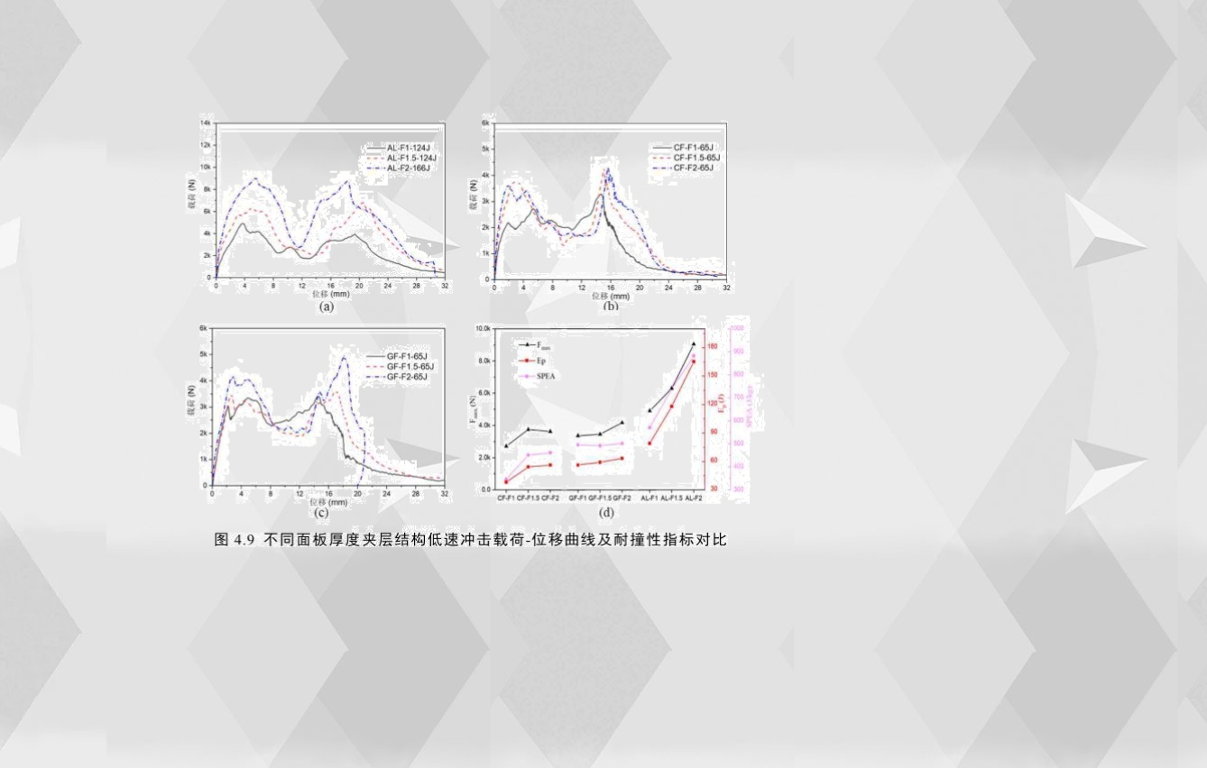 為了研究夾層結(jié)構(gòu)的面板厚度對沖擊性能的影響,圖4.9(a)-(c)比較了三種不同面板厚度的夾層結(jié)構(gòu)的載荷-位移曲線。無論是彈塑性面板還是脆性面板,夾層結(jié)構(gòu)的面板厚度對其低速沖擊響應(yīng)均有較大影響。為了更直觀地比較,圖4.9(d)對比了不同面板厚度夾層結(jié)構(gòu)的耐撞性指標(biāo),通過觀察,鋁合金夾層結(jié)構(gòu)的耐撞性能隨面板厚度增加而明顯增加,面板厚度從1mm增加到2mm,其初始峰值載荷、穿透吸能和比穿透吸能分別提高了84%、108%和54%;對玻璃纖維夾層結(jié)構(gòu)而言,當(dāng)面板厚度從1mm增加到2mm,其初始峰值載荷和穿透吸能分別只提高了24%和13%,而面板厚度的增加對比穿透吸能的影響效果差異不大;而對碳纖維夾層結(jié)構(gòu)而言,當(dāng)面板厚度從1mm增加到2mm,其穿透吸能和比穿透能分別提高了42%和33%,并且隨著層數(shù)的增加,耐撞性指標(biāo)增加的幅度大幅減小。