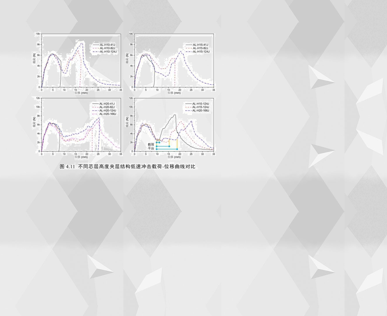 圖4.11為相同配置的夾層結(jié)構(gòu)在不同沖擊能量下及不同芯層高度的試件在穿透能下的載荷-位移曲線,通過對比可以看出,芯層高度為10mm、15mm和20mm的試件的載荷-位移曲線基本相似,曲線均具有兩個波峰且波谷處載荷大小相差不大;不同的是,隨著試件芯層高度的增加,波谷附近的載荷平臺的長度逐漸變長。