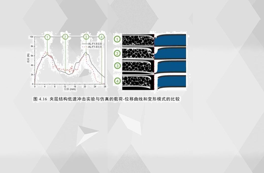 圖4.16比較了AL-F1.5試驗和仿真在完全穿透沖擊能量下的載荷-位移曲線以及不同沖擊能量下的變形過程。可以看出,無論是抗沖擊響應還是結(jié)構(gòu)變形模式,試驗和仿真都吻合得較好。由于仿真加載過程中網(wǎng)格單元的失效以及刪除使得其載荷-位移曲線存在一些波動,而其初始峰值載荷和穿透吸能的誤差范圍保持在5%和10%以內(nèi)。